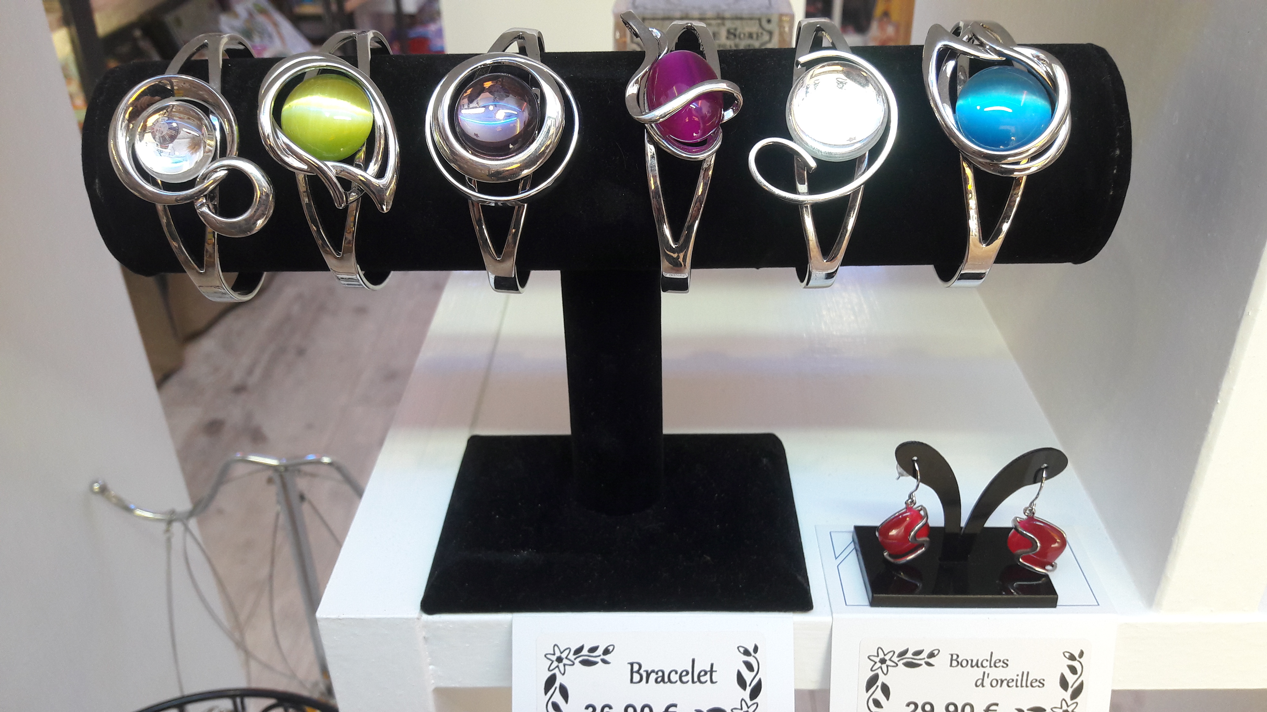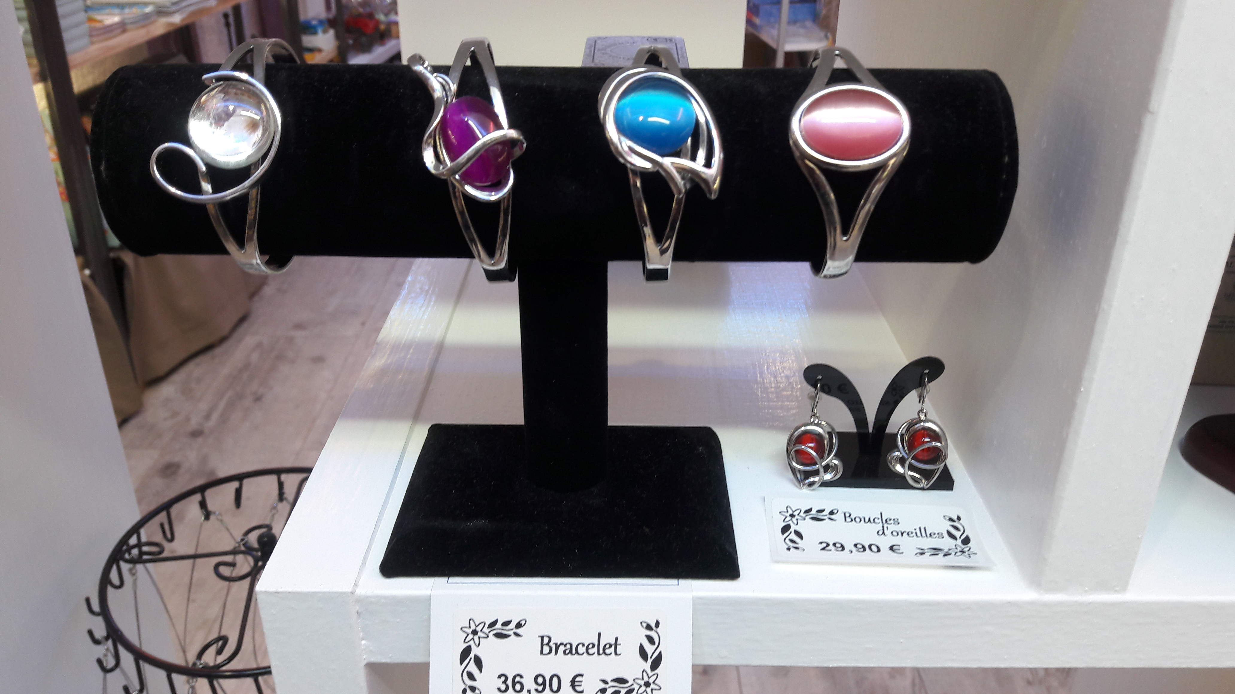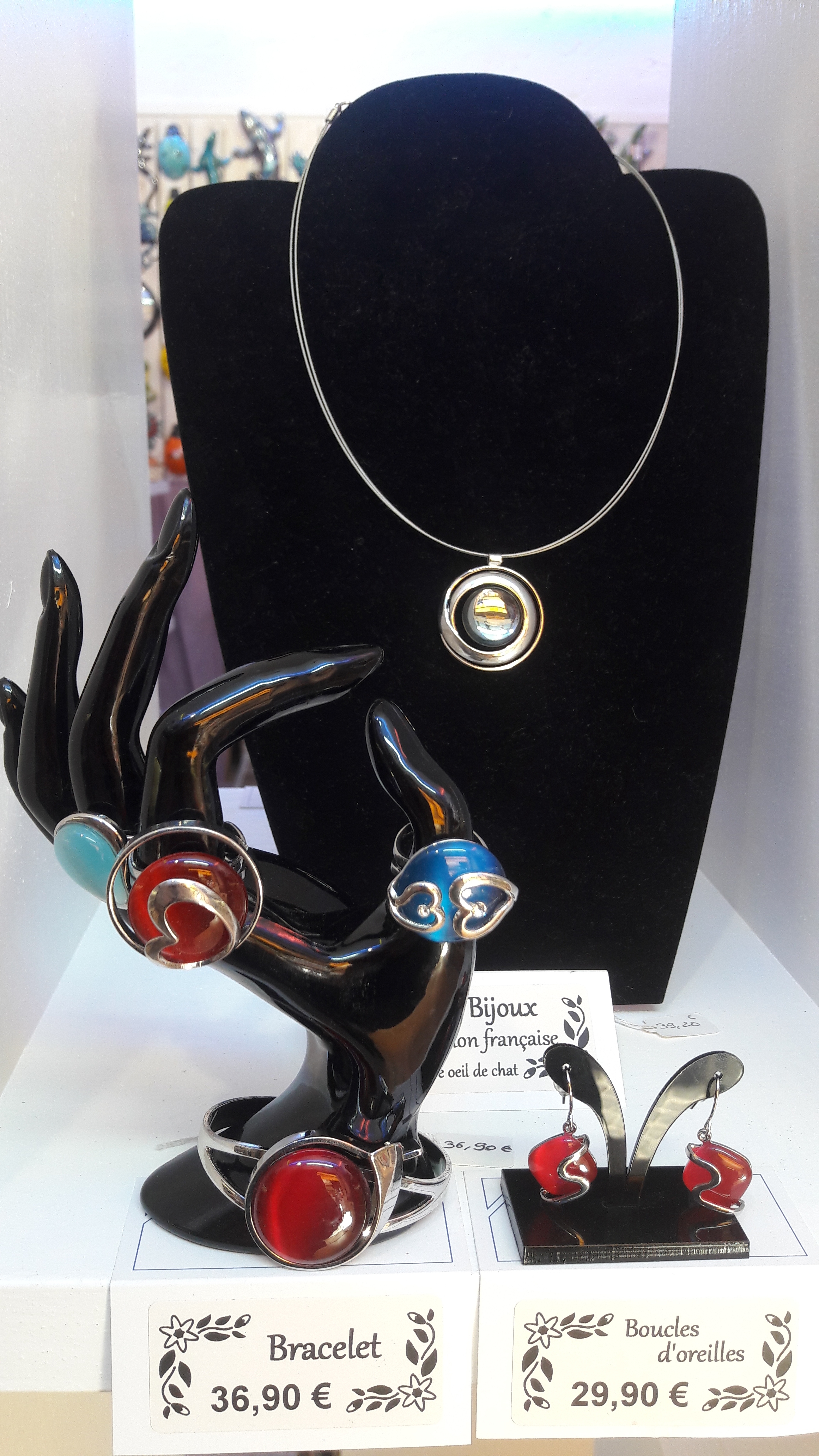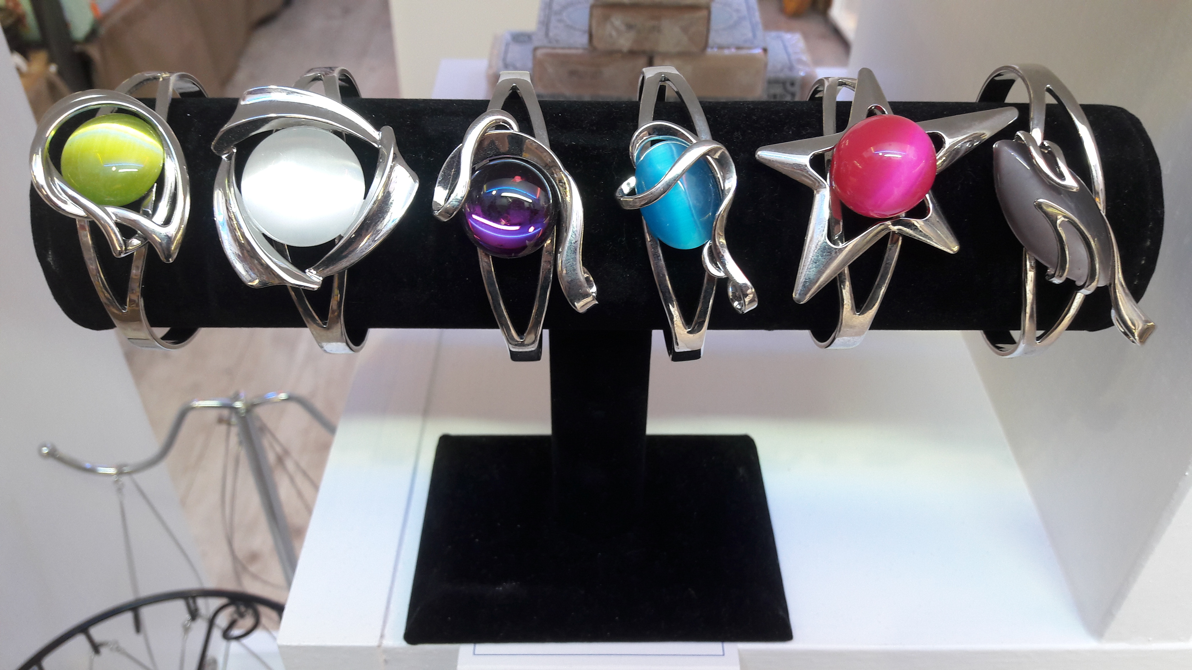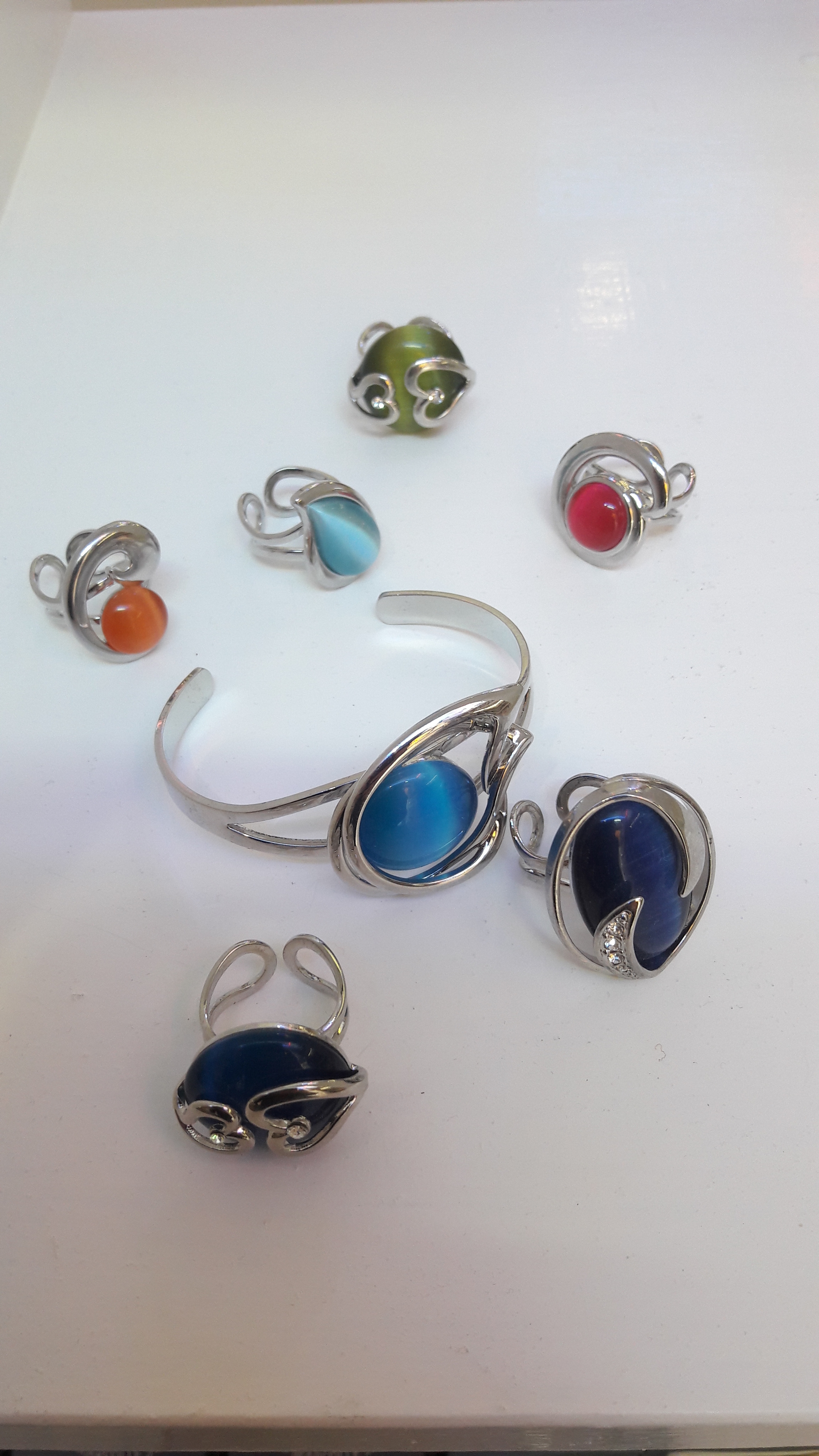 Bijoux fantaisie de très belle fabrication avec une pierre œil de chat ou verre coloré aux reflets élégants.