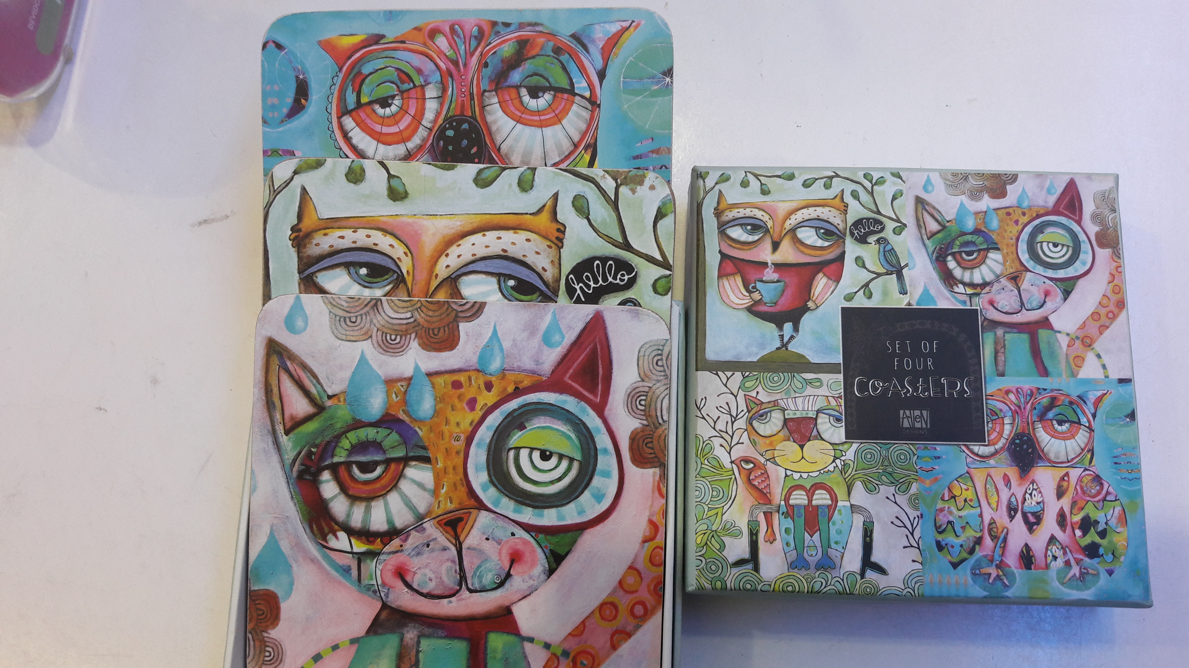Une collection originale et pleine de couleurs avec comme mascottes : un chat, un hibou et une grenouille.