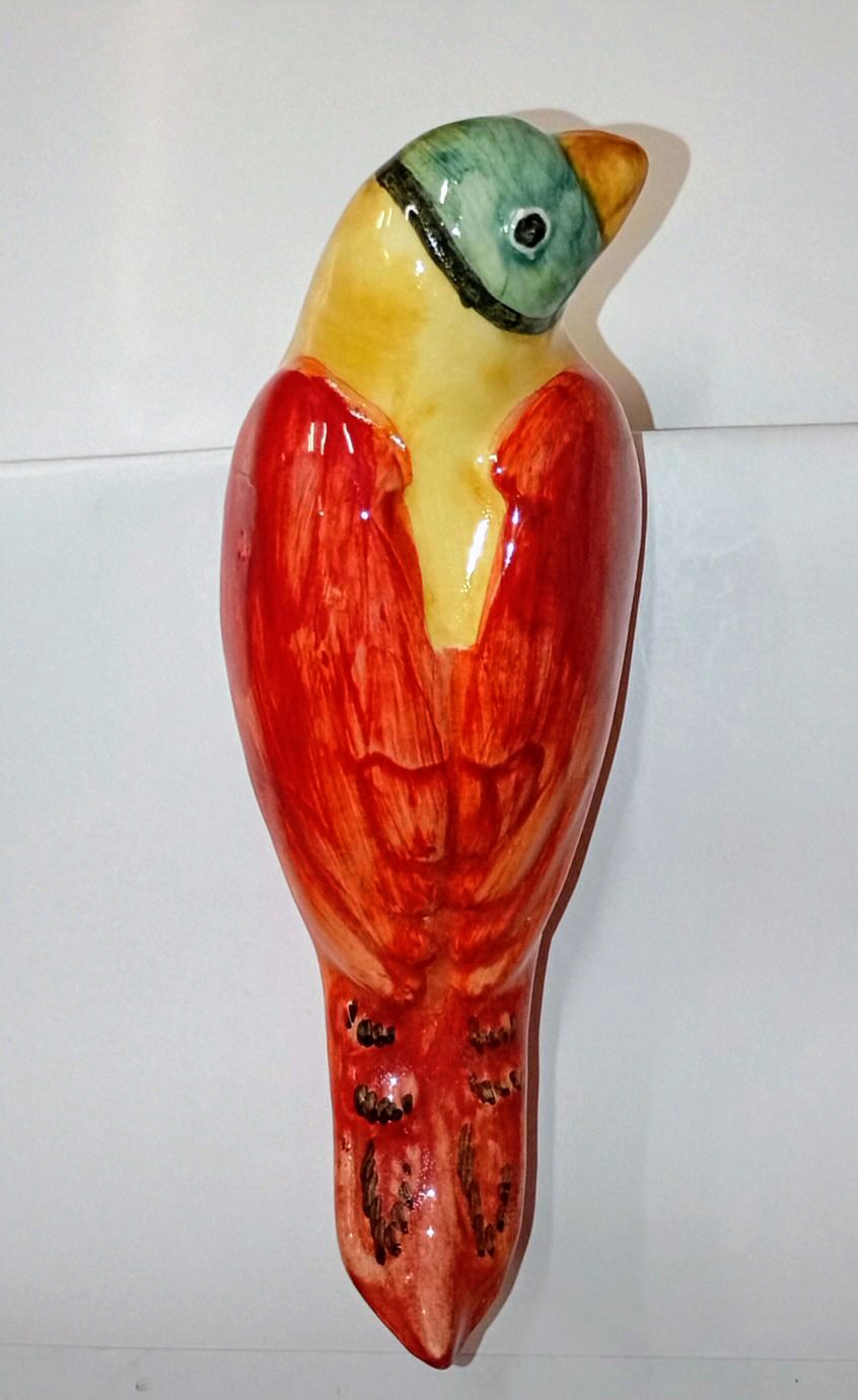 Ce bel oiseau coloré est en en céramique à accrocher dehors ou dedans.