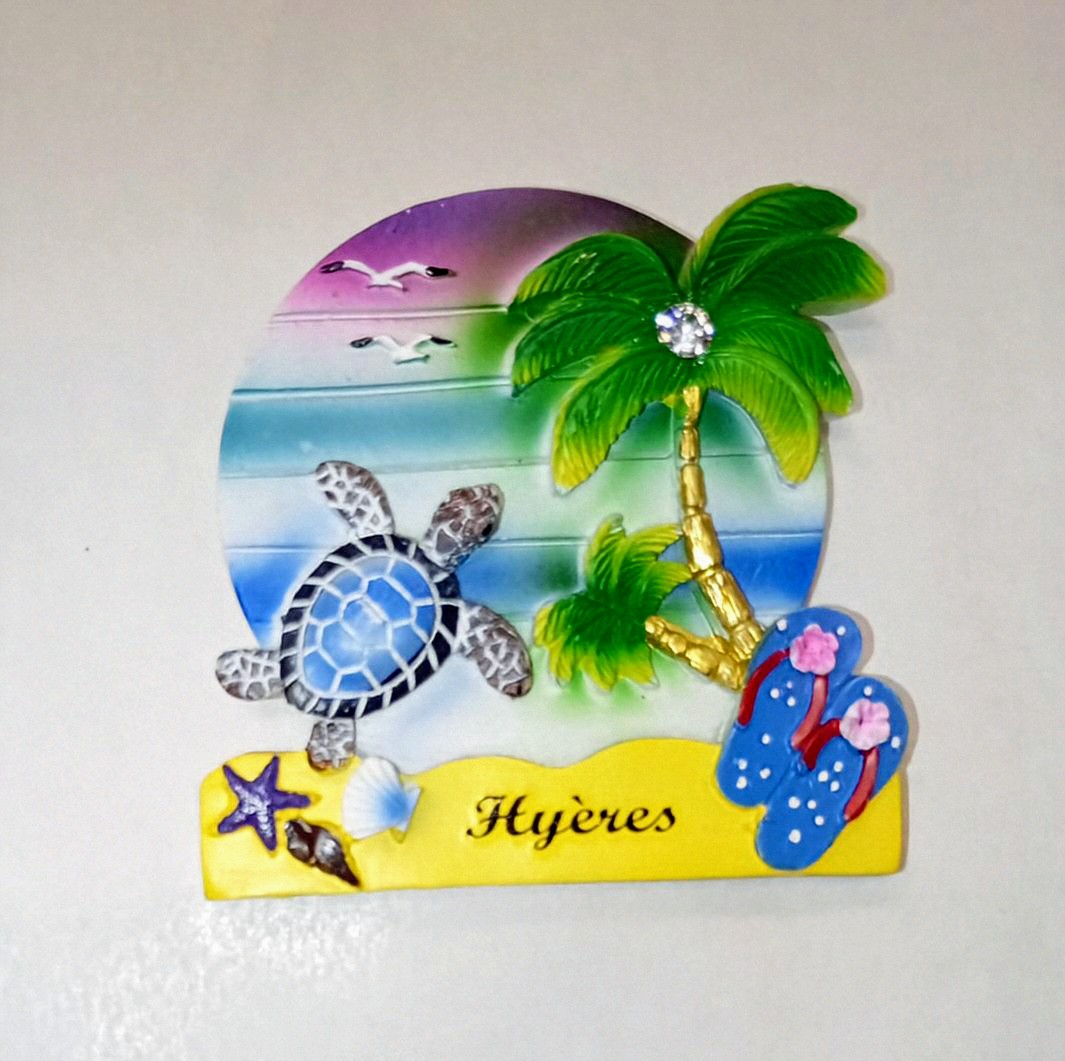 Magnet en relief en résine tortue, dauphins,Hyères les palmiers