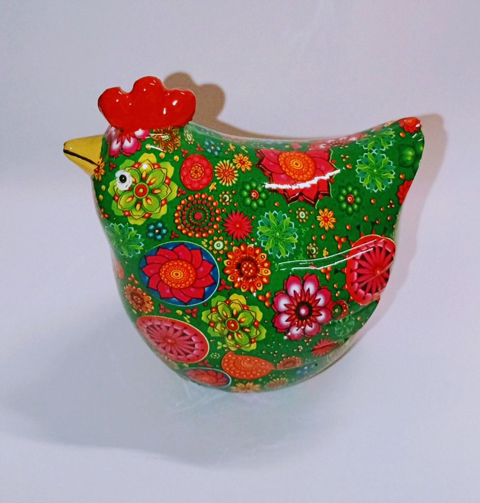 Jolie petite poule ,tout en rondeur, en résine décorée de motifs aux couleurs vives.