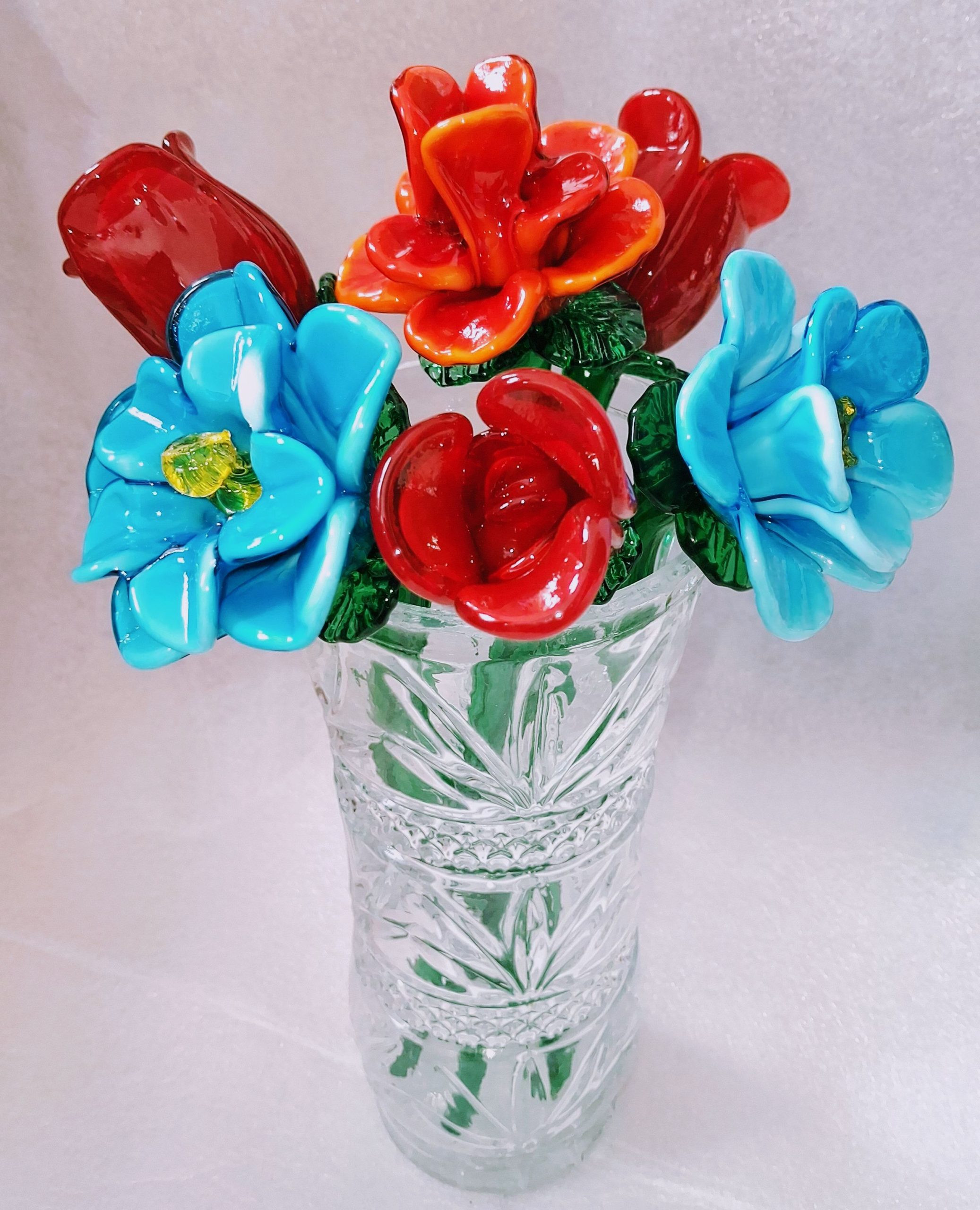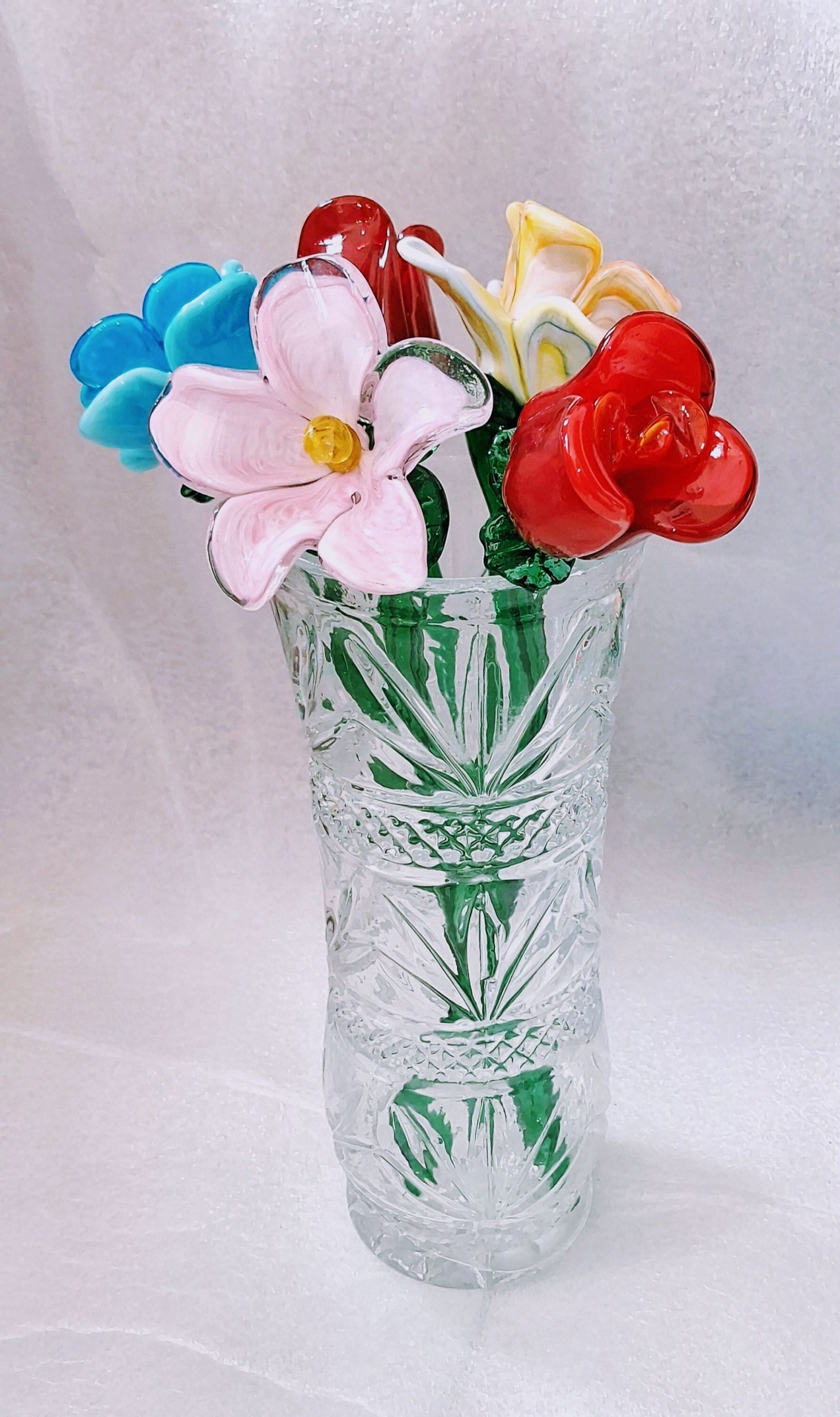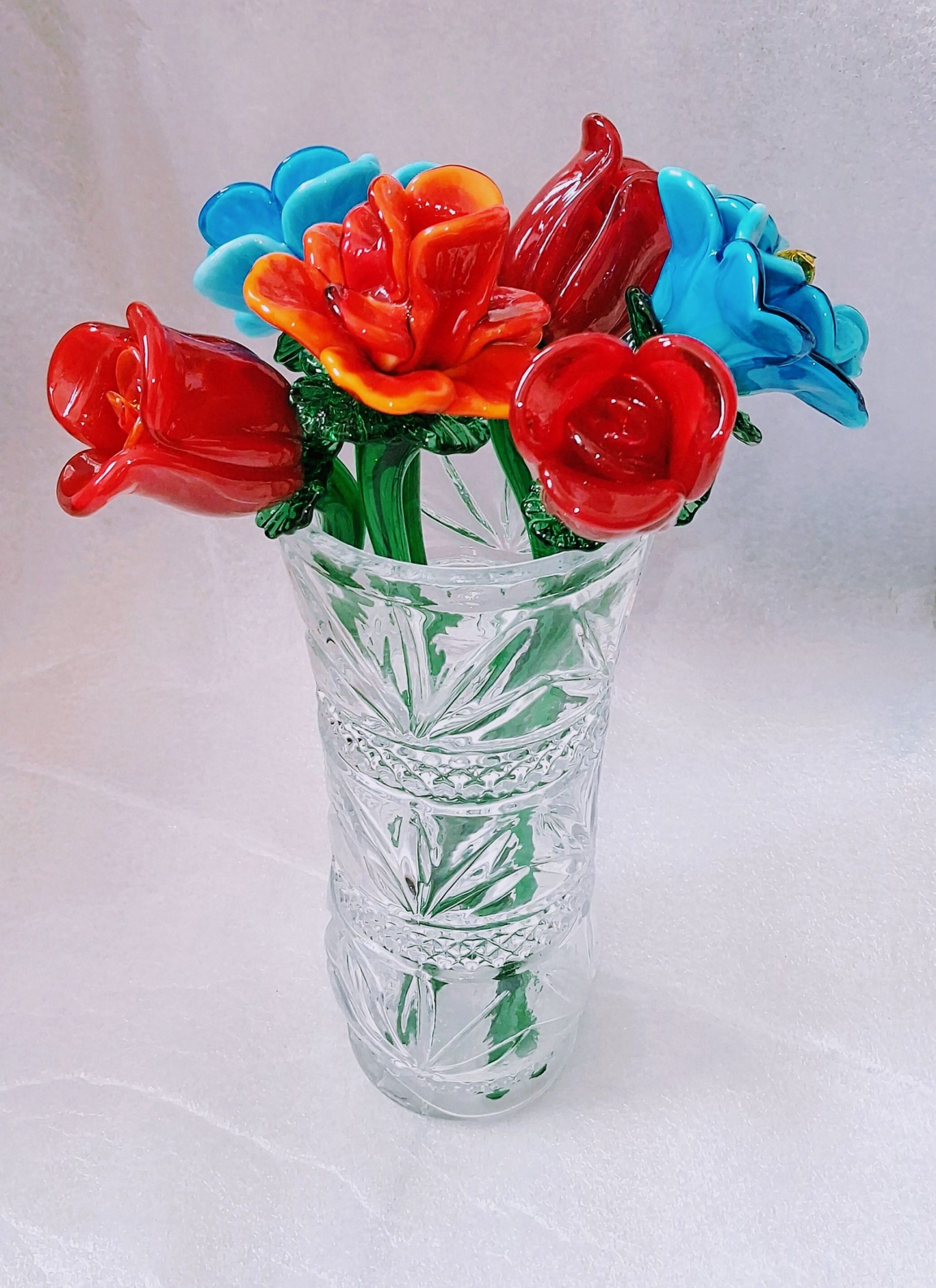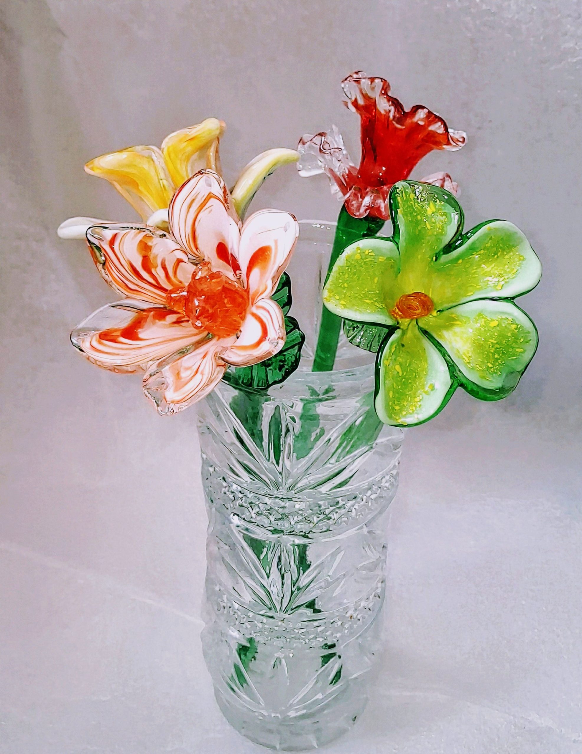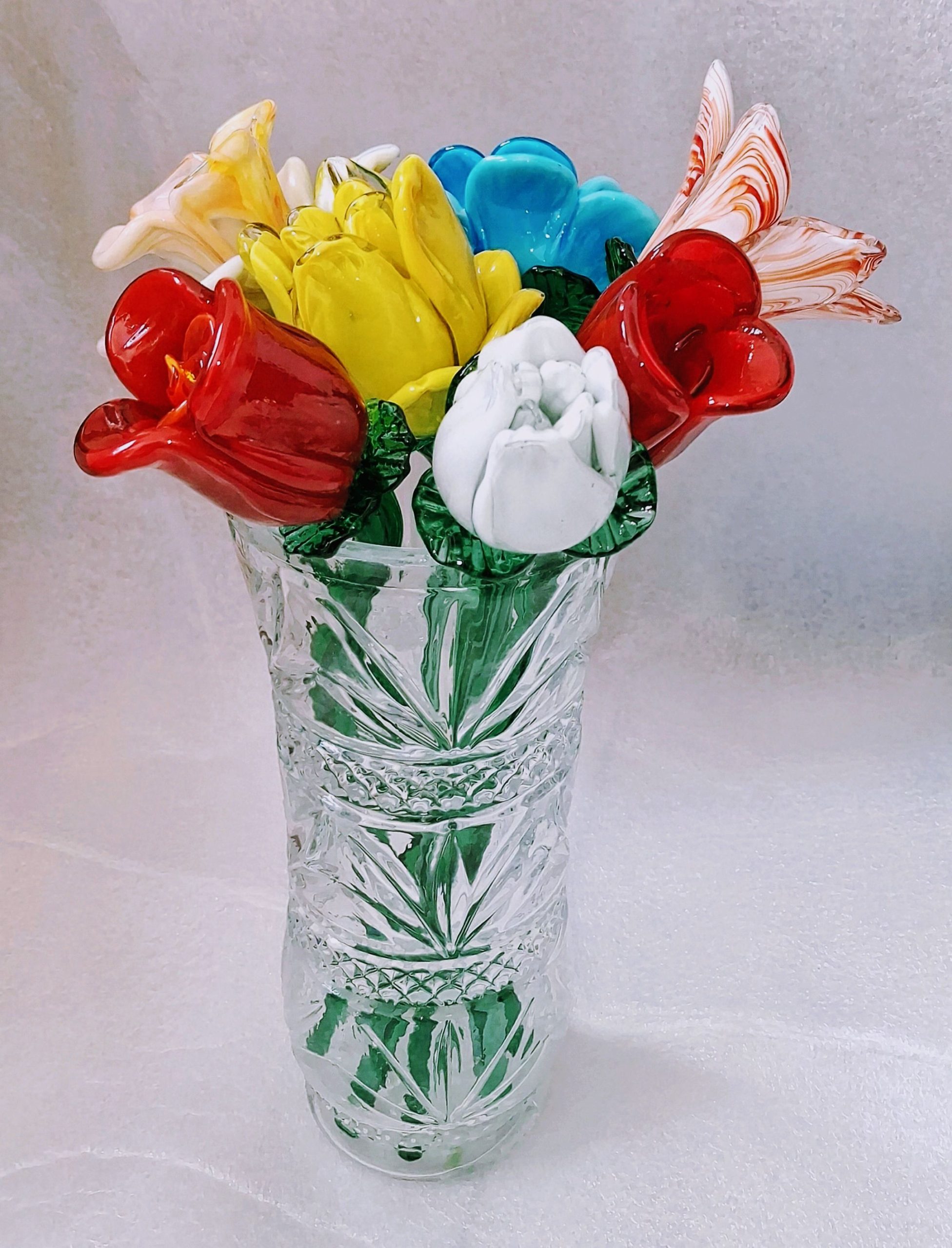 Rose, narcisse, tulipe, coquelicot, arum, fleur de lys, gardénia, freesia, jonquille en verre soufflé