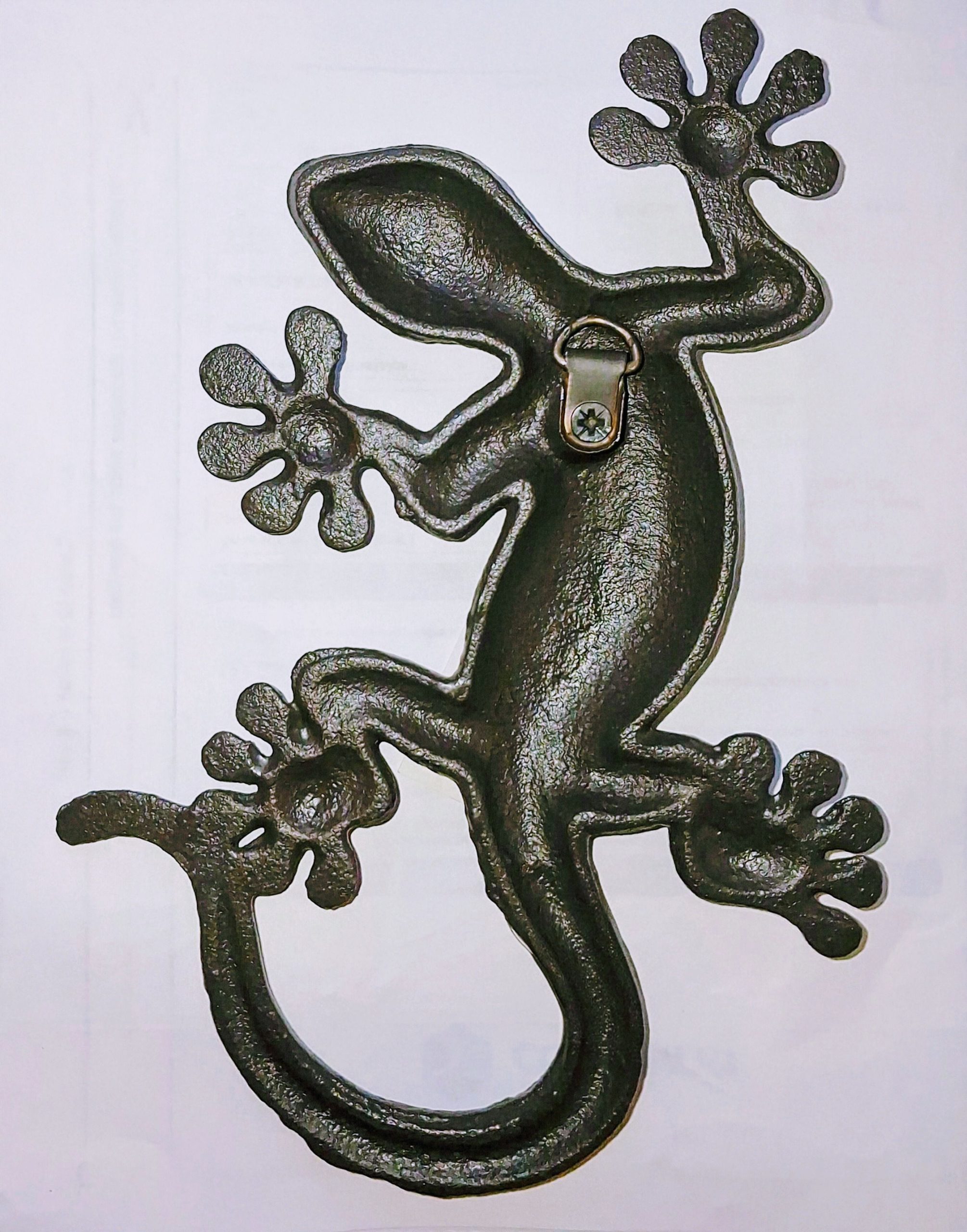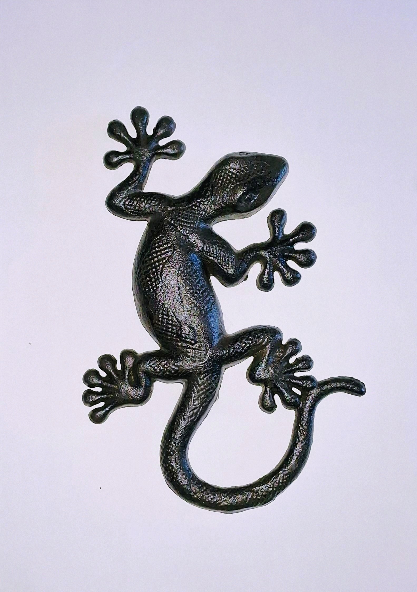 Petit complément de décoration sur un mur d’une terrasse ou d’un jardin ,mignon petit lézard gecko (le gecko étant un petit lézard du portoir méditerranéen) en fonte patine aspect rouille, très facile à fixer .Il sera aussi très joli posé sur une table (en intérieur ou extérieur) en décoration.